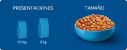 Maíz amarillo molido, harina de soya, harina de subproductos de pollo, harina gluten de maíz, grasa animal estabilizada con antioxidantes, arroz partido, harina de salmón, trigo, fibra de soya, digesto animal, levadura de cervecería, queso rallado, tomate deshidratado, zanahoria deshidratada, espinaca deshidratada, vitamina C/E, DL-metionina, ácido fosfórico, celulosa, sal, carbonato de calcio, fosfato bicalcico, cloruro de potasio, cloruro de colina, premezcla minerales quelatados, suplementos vitamínicos, dióxido de titanio, taurina, L-lisina, colorantes.