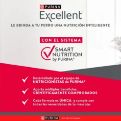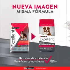 Los perros adultos tienen diferentes necesidades nutricionales que los cachorros o los perros maduros. PURINA® Excellent® FORMULA MAINTENANCE ADULT ofrece una fórmula completa que incluye tocoferoles mezclados fuente de vitamina E, y sin colorantes ni saborizantes artificiales aportando un óptimo balance nutricional y un sabor irresistible.