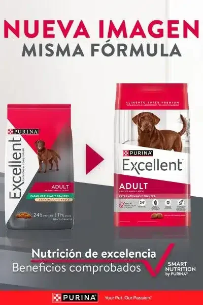 Los perros adultos tienen diferentes necesidades nutricionales que los cachorros o los perros maduros. PURINA® Excellent® ADULTOS POLLO Y ARROZ RAZAS MEDIANAS Y GRANDES ofrece una fórmula completa que incluye aminoácidos esenciales, inulina, vitaminas, minerales y zeolita, aportando un óptimo balance nutricional y un sabor irresistible.